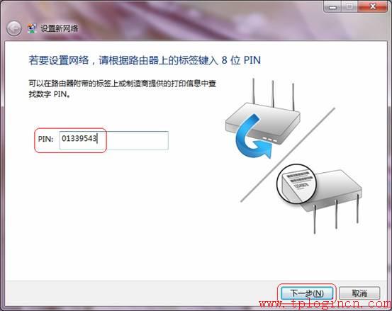 2、 輸入路由器底面板上的8位PIN碼,點擊“下一步”。
